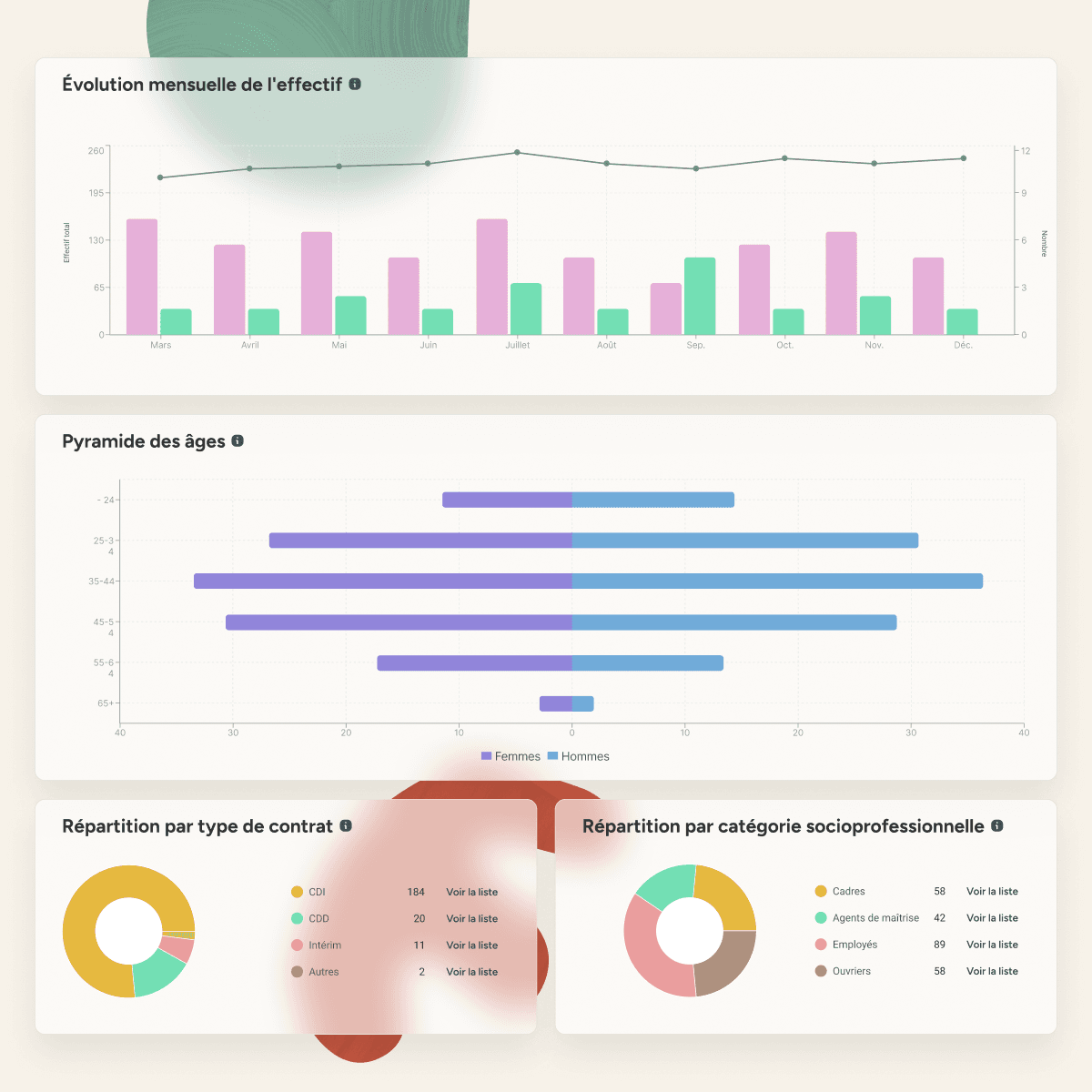 Suivi précis de la masse salariale, des effectifs, ou encore de l'absentéisme, pour une gestion optimale du capital humain.