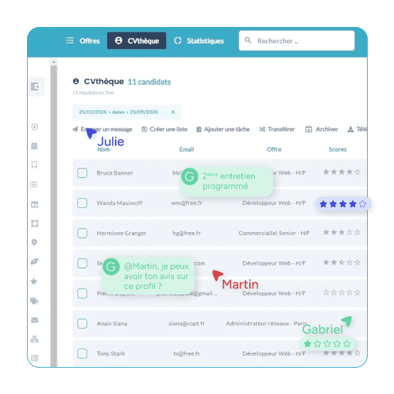 Faites participer vos équipes décisionnaires à chaque étape, tout en gardant une cohérence dans les échanges avec les candidats.